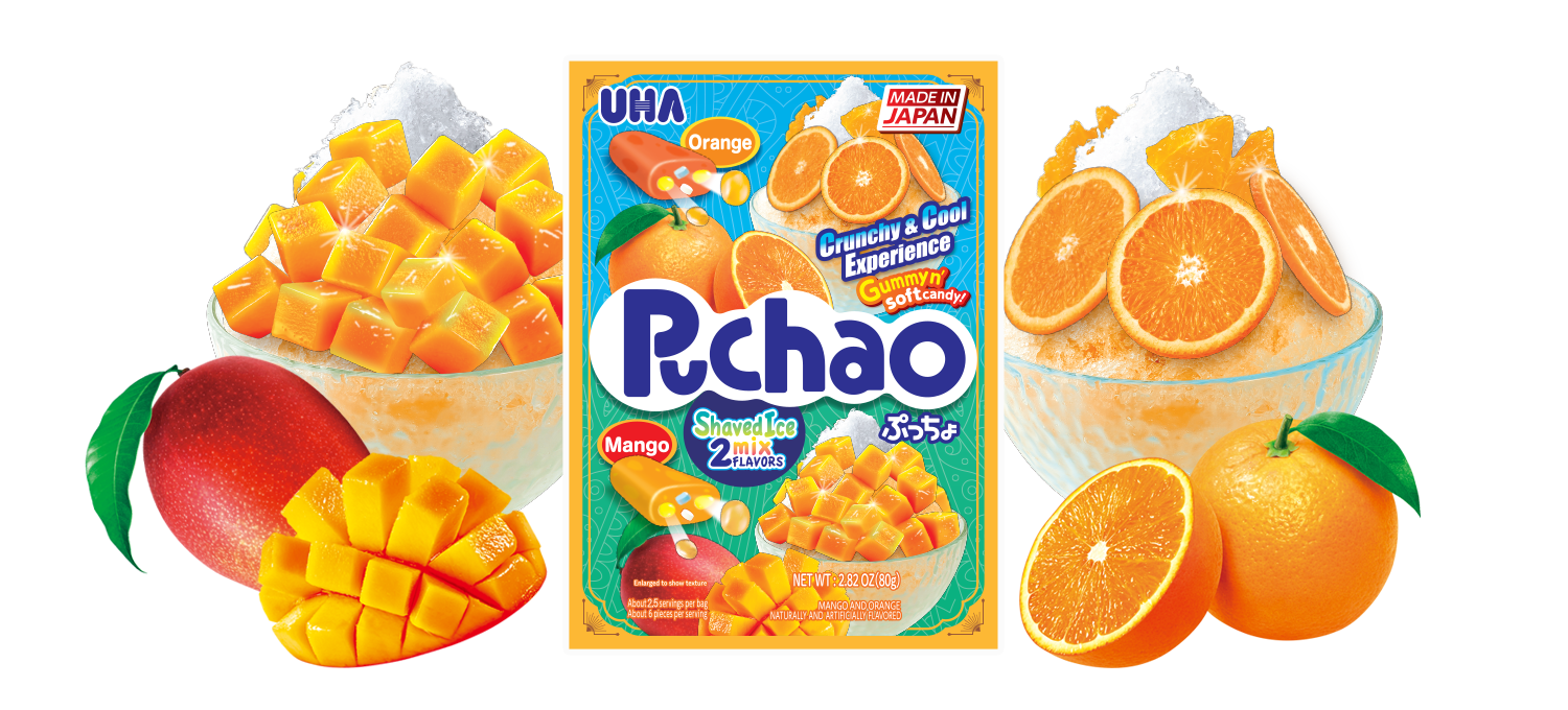 Only Puchao, the Japanese candy, gives you the fantastic combo of fruits flavored soft candy and gummies with fizzy tablets!
