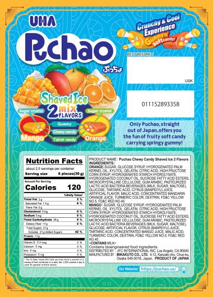 MANGO: SUGAR, GLUCOSE SYRUP, HYDROGENATED PALM KERNEL OIL, XYLITOL, GELATIN, CITRIC ACID, HIGH FRUCTOSE CORN SYRUP, HYDROGENATED STARCH HYDROLYSATE, HYDROGENATED COCONUT OIL, SUCROSE FATTY ACID ESTERS, MICROCRYSTALLINE CELLULOSE, GUM ARABIC, PASTEURIZED LACTIC ACID BACTERIA BEVERAGES (MILK, SUGAR, MALTOSE), GLUCOSE, ARTIFICIAL FLAVOR, CITRUS (BANPEIYU) JUICE, TARTARIC ACID, CONCENTRATED MANGO JUICE, MALIC ACID, TURMERIC COLOR, DEXTRIN, FD&C YELLOW NO.5, FD&C RED NO.40.